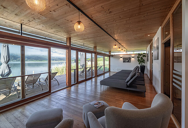 Zwischen Schilf und Sträuchern versteckt steht hier unser SEE SPA. Das Saunahaus ist über einen eigenen Steg erreichbar. Es bietet 3 verschiedene Saunen (1x finnische Sauna, 1x Aroma Sauna, 1x Infrarotkabine) und einen Ruheraum mit Panoramafenster. Außergewöhnlich ist die uneinsichtig gelegene Seeterrasse, von der man sich mit einem Sprung ins kühle Nass erfrischen kann.